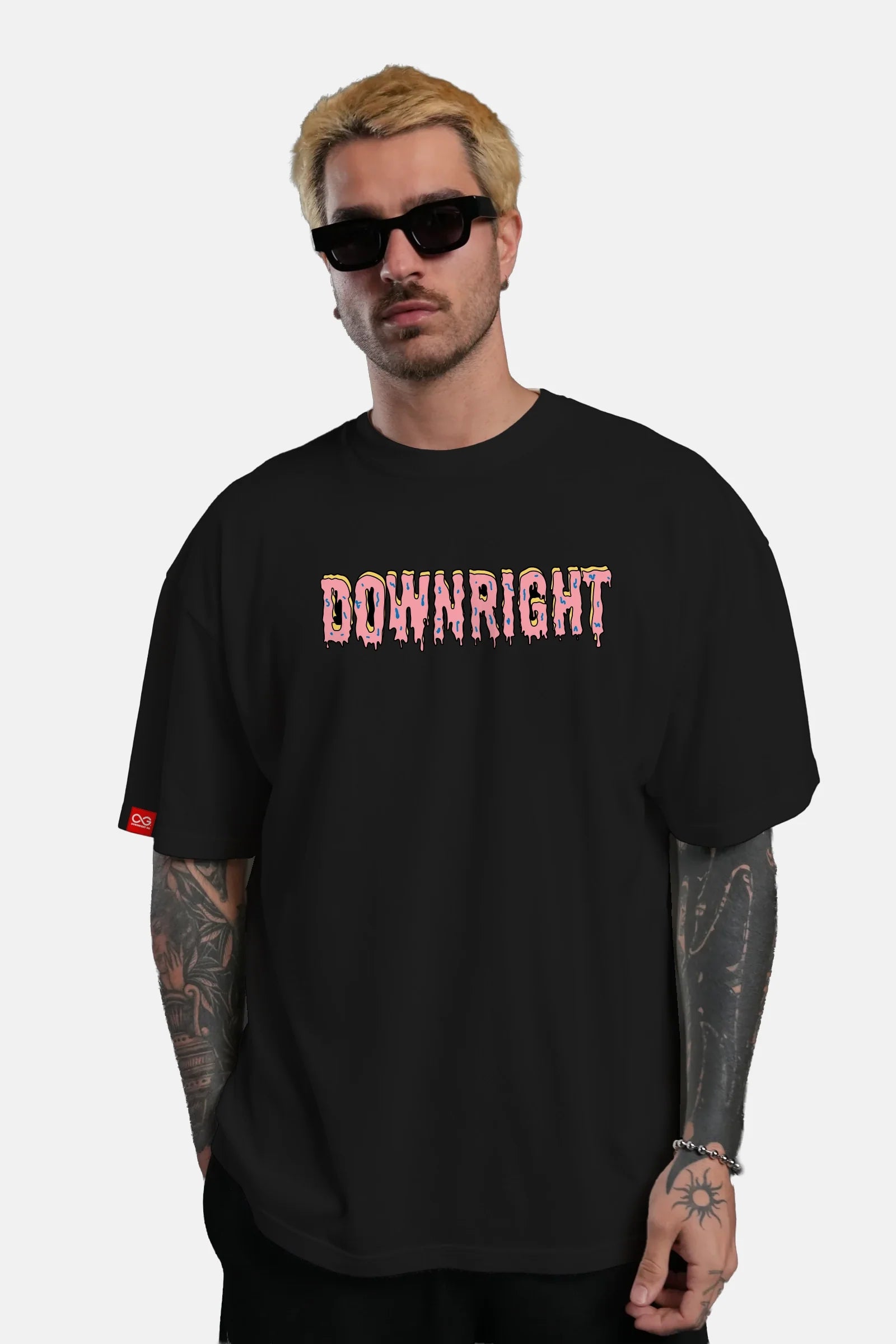 - "DOWNRIGHT" donut-style typography on chest
